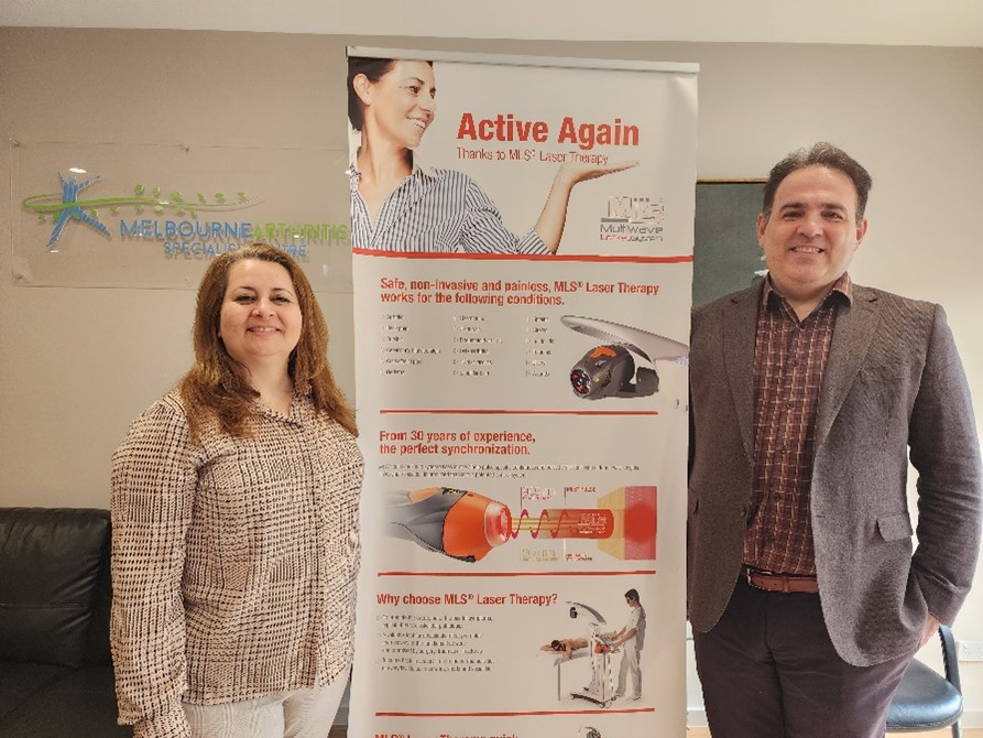 Dr Farshad Ghazanfari (right) and his wife, Morvarid Sadeghian (left), from the Melbourne Arthritis Specialist Centre standing with MLS® laser’s ‘Active Again’ banner.