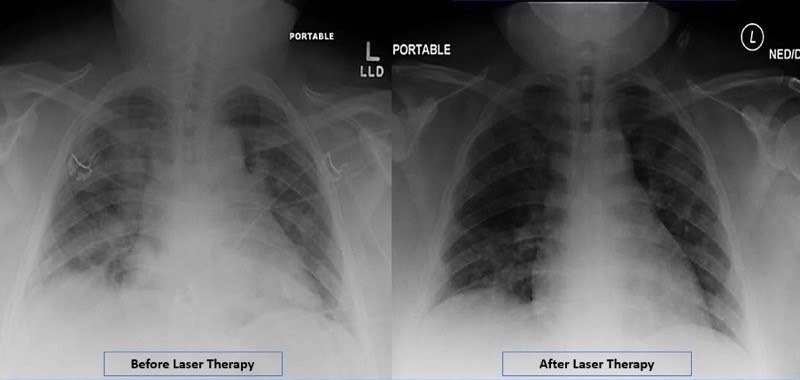 The patient, a 32-year-old Asian woman diagnosed with SARS-CoV-2, was treated with once-daily, 28-minute PBMT sessions for four days using an FDA-cleared Multiwave Locked System (MLS) Therapy Laser (ASA Laser, Italy). The MLS Therapy Laser used in this study is distributed exclusively in North America by Cutting Edge Laser Technologies based in Rochester, N.Y. The patient’s response to PBMT was evaluated by comparing different scoring tools before and after laser therapy, all of which improved following therapy. Results showed increased oxygen saturation (from 88–93% to 97%), improved RALE Chest X-ray score (from 8 to 3), and decrease in inflammatory markers: IL-6 levels (45.89 pg/mL to 11.7 pg/mL) CRP levels (3.06 mg/dL to 1.43 mg/dL) and Ferratin levels (359 ng/mL to 175 ng/mL).